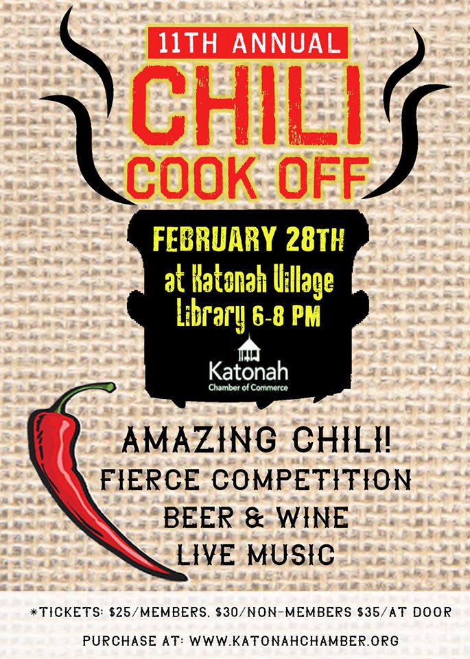 Join us for the 11th Annual Katonah Chamber of Commerce Chili Cook-off! 16 chili chefs – from renowned local chefs to local business owners throwing their hat in the ring to a 4+ time chili cook-off award winning mom to dads who are known for their impeccable cooking, this competition will be on fire! Live music, tons of beer and wine (huge thanks to Captain Lawrence, Brew & Co. and Katonah Wine & Liquor), raffles and delicious chili! $30 in advance or $35 at the door. Crawfish chili, bison chili, vegetarian chili – come get a taste of it all!!!