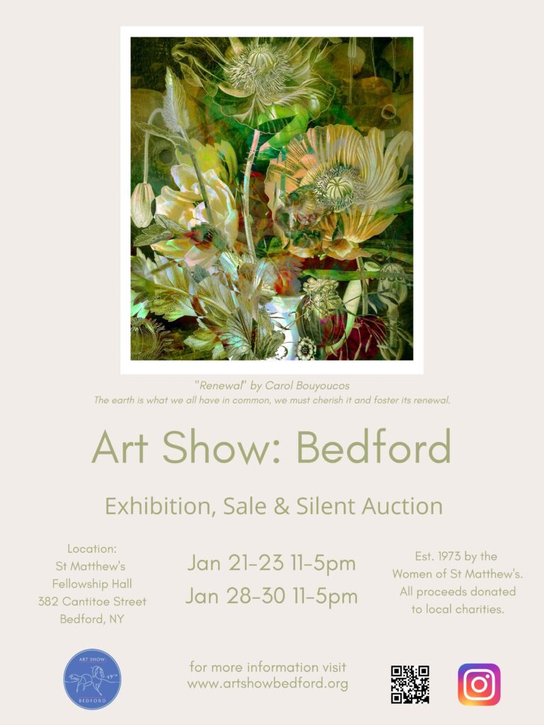 January 2022 marks the 49th year of Art Show: Bedford, an eagerly awaited annual community event that unites the arts with charitable giving. The art show features a blend of contemporary and traditional artwork in all media and is a fundraiser for many local non-profits. The event will be held in the Fellowship Hall at St. Matthew’s Church in Bedford, at 382 Cantitoe Street, over the course of two weekends in late January.