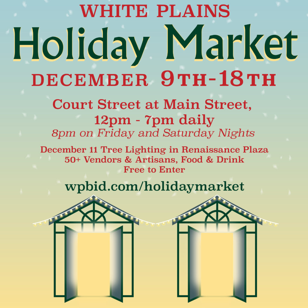 The White Plains Holiday Market is made possible by the generous support of local and regional businesses including platinum sponsor Galleria at White Plains, with support from, Silverman Realty, Cappelli Organization, The Premier Collection, Heineken USA, White Plains Hospital, Rose Associates, Apple Bank, The Gino Bello Homes Real Estate, Saber Real Estate North LLC, Manor Sangria, The Mitchell Apartments and more.