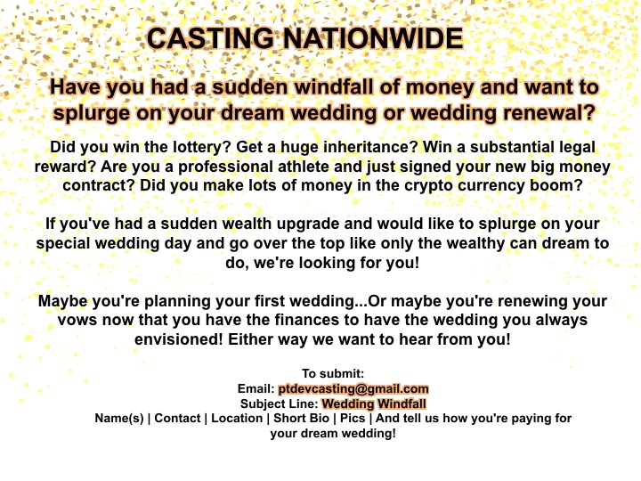 LifestyleCasting Couples who have had a sudden windfall of money and want to splurge on their dream wedding or wedding renewa Posted on October 26, 2018October 26, 2018 by Stacy G 26 Oct From the producers of TLC Wedding Series “I WANT THAT WEDDING” are now casting couples with over the top weddings! Stacy G It's What I Know. Who I know .Where I want to go. How to Fit Your Life Insurance Premium into Your Budget Signs your kid has maxed out on Halloween candy!