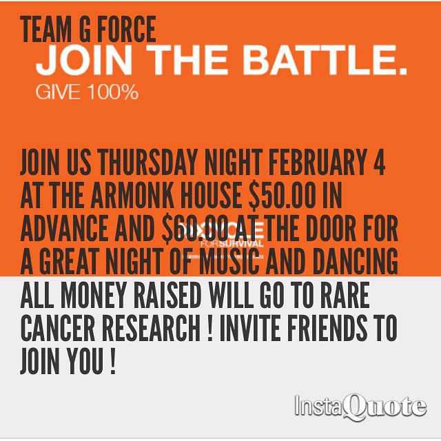 Please join us at THE ARMONK HOUSE February 4th from 7:00pm- 10:00pm for our fundraising event for Cycle For Survival. Team G Force is working hard to raise money for rare cancer research. All funds raised go directly to Memorial Sloan-Kettering Cancer Center Cycle for Survival