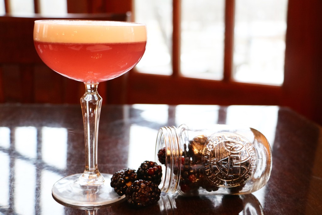 Muddle blackberries in a shaker tin. Add all ingredients into your shaker tin without ice. Dry shake ingredients for 12 seconds. Add ice & shake for 12 more seconds. Double strain ingredients into a large coupe glass