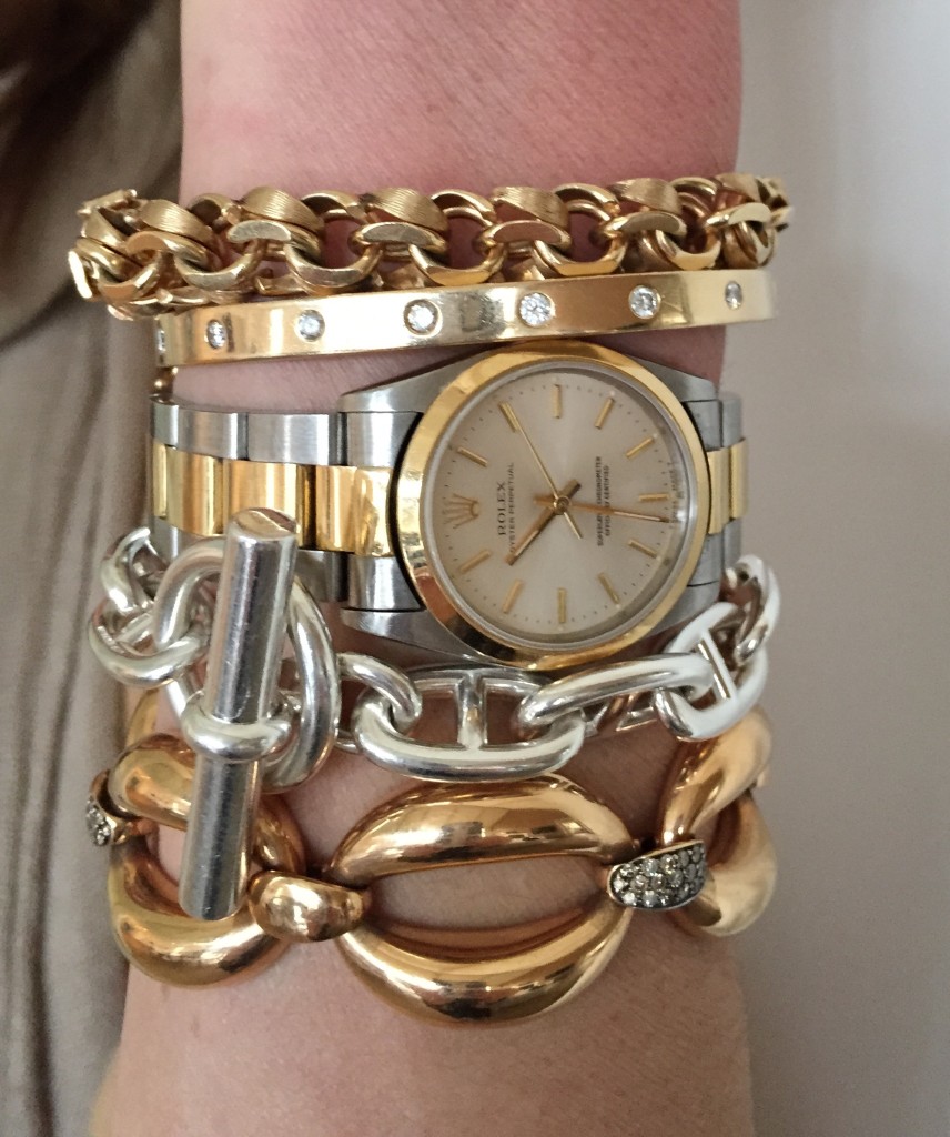 Mix metals and mix textures. Focus on one statement. For example: Try a big classic watch and stack some bangles but soften with your chain-linked bracelets of different sizes.