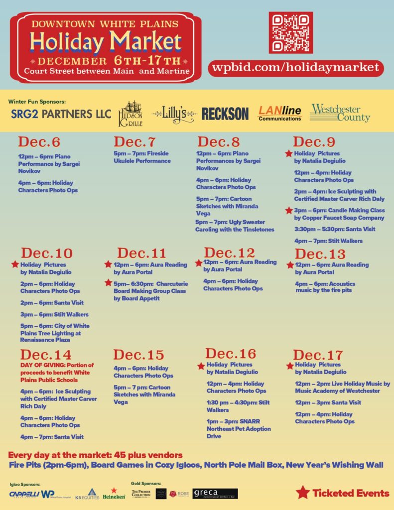 WHITE PLAINS, N.Y. December 7, 2023– With Thanksgiving turkey roasters barely shelved, many outdoor Holiday Markets have begun rising around New York City and its environs, including throughout Westchester County. But this year, the Downtown White Plains Holiday Market seeks to up its holiday market game to draw more visitors downtown by going beyond the now-standard glass vendor sheds to also present a line-up of unique seasonal surprises appealing to all ages… most of them free!