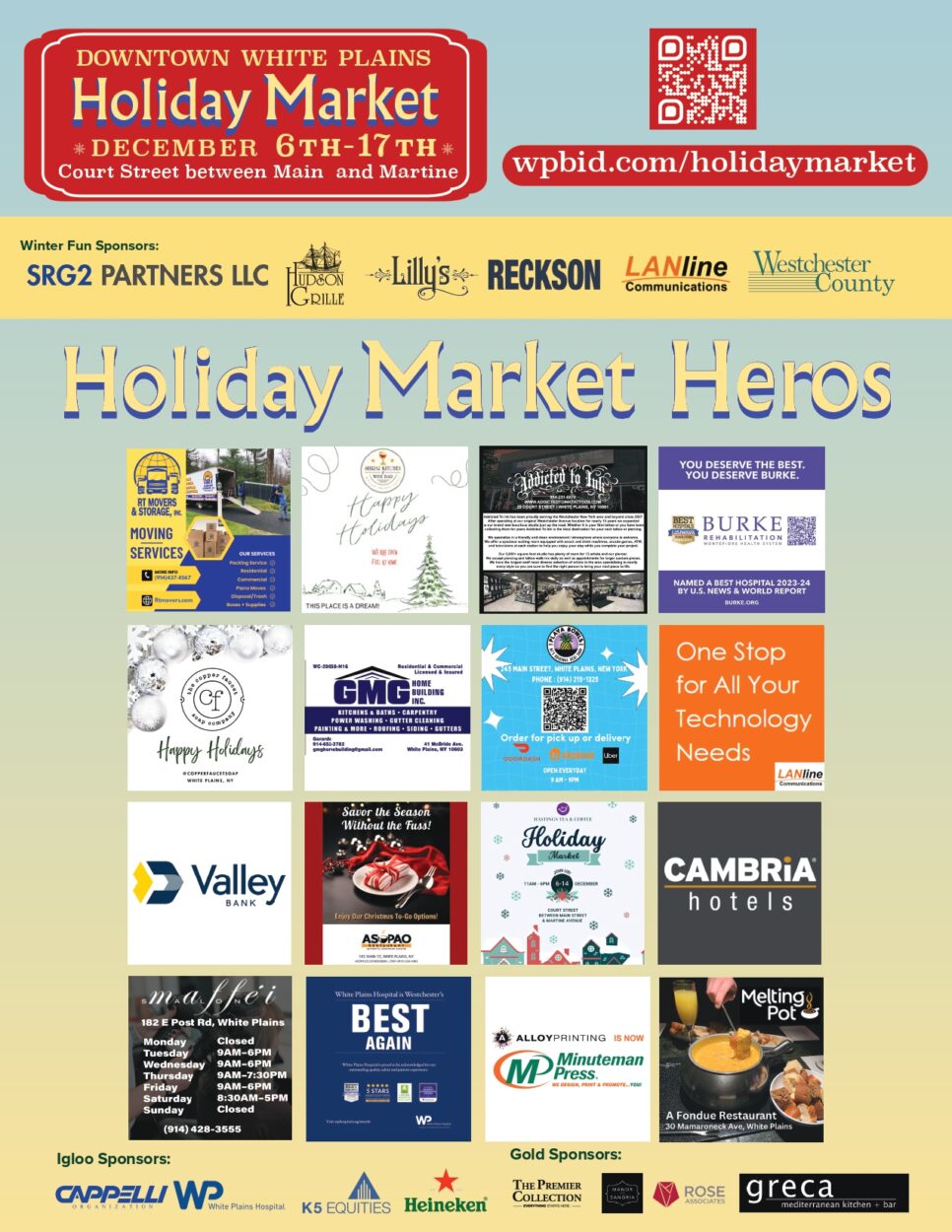 In addition to the Entertainment and Igloo Level sponsors listed above, Rose Associates, The Premier Collection, Manor Sangria and Greca Mediterranean Kitchen and Bar are supporting the event as Gold Sponsors. Minuteman Press of Downtown White Plains, Nicholas Wolff of Howard Hanna Real Estate Services and The Cambria White Plains are Small Business Holiday Market Hero Sponsors.