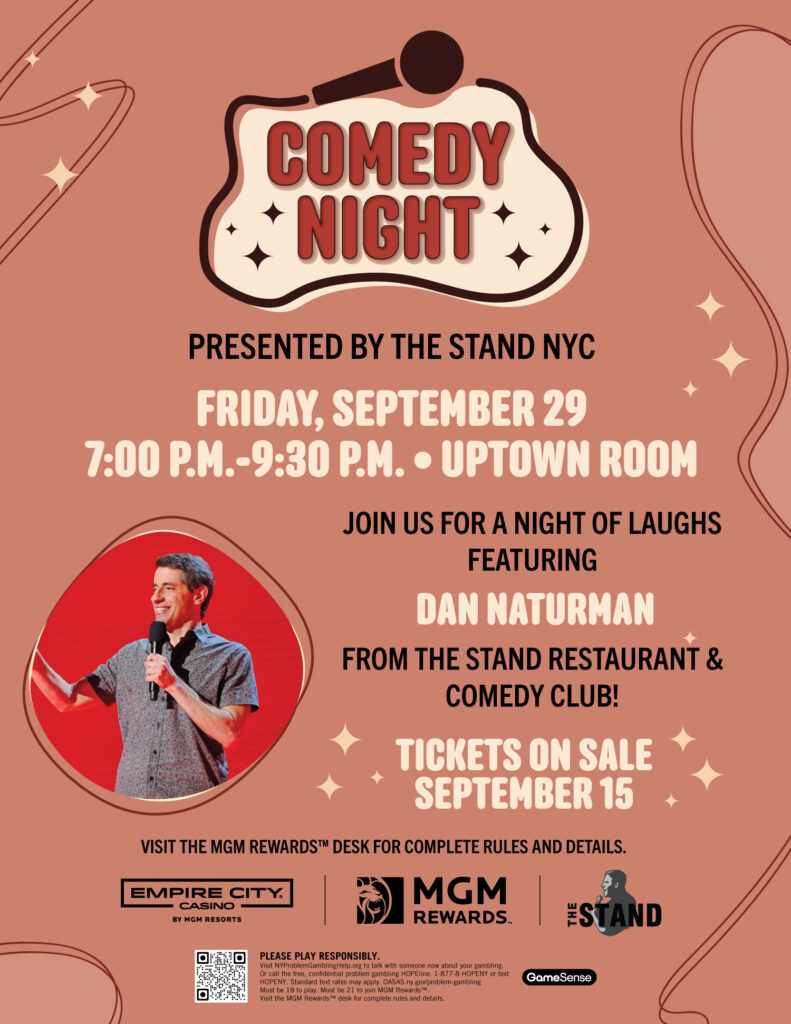 It’s no joke! A night of laughter is in the cards for Friday, September 29, 2023, at Empire City Casino by MGM Resorts (“Empire City”). The Stand Presents Dan Naturman will take place at 8:00 p.m. in the casino’s second-floor Uptown Room. Tickets are available for $25 each online at SeeTickets.US .