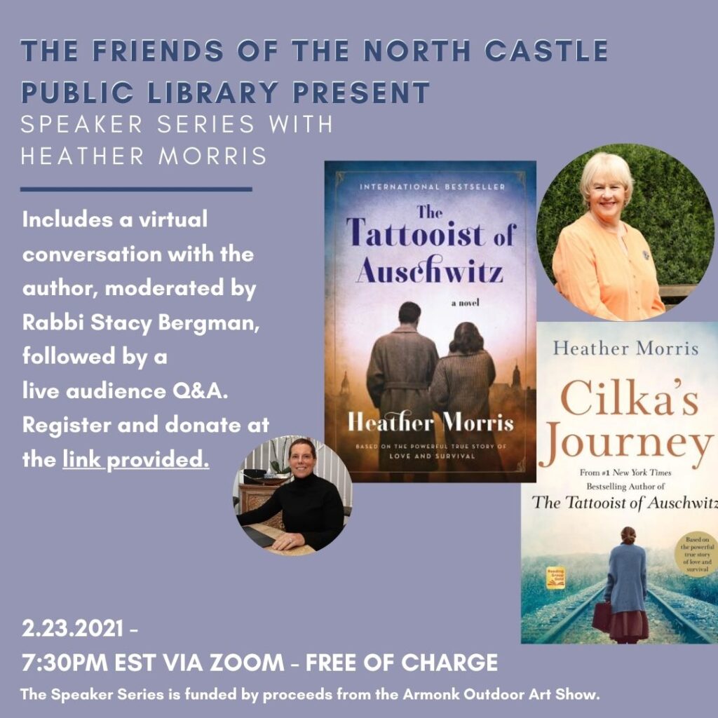 Please join The Friends of the North Castle Public Library Speaker Series will host Heather Morris who will talk about her bestselling novel, The Tattooist of Auschwitz on February 23, 2021, at 7:30 PM. Rabbi Stacy Bergman will moderate.