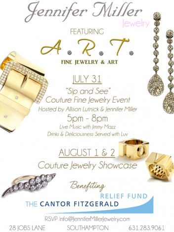 Jennifer Miller is a style staple of an illustrious set of Hamptonites and is excited to exclusively introduce the couture jewelry of A.R.T. from Palm Beach to the Hamptons. A portion of the proceeds will benefit Cantor Fitzgerald Relief Fund. Come enjoy live music, drinks, and deliciousness at this kick off event, hosted by Allison Lutnick and Jennifer Miller. 5-8 p.m. 28 Jobs Ln., Southampton, 631-283-9061; jennifermillerjewelry.com