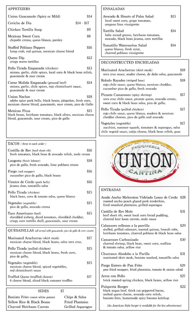 The menu will include signature dishes such as the Castilla de Res Mole – a beef short rib with sweet local corn bread pudding, charred heirloom carrots and mole sauce, and the innovative Deconstructed Enchiladas, which come in five variations: Marinated Aracherras (skirt steak), Robalo Rayados (striped bass), Picante Camarones (spicy shrimp), Pollo Tirada (pulled chicken) and Vegetales (vegetable). Pair these flavorful dishes with Union Cantina’s signature cocktail Cinnamon Sol, which is a refreshing mix of Don Julio Reposado, cinnamon, pineapple & fresh lime juices.