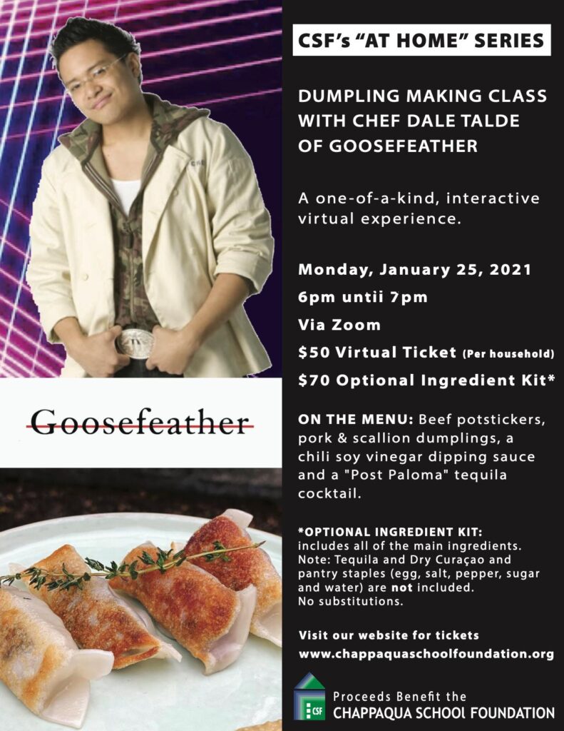 WHAT: An interactive and live culinary experience, Chef Talde will host a fun hour of dumpling making and whip up a signature cocktail. Proceeds from this virtual event benefit the Chappaqua School Foundation (CSF), a non-profit recognized as tax-exempt under Section 501(c)(3) of the Internal Revenue Code.