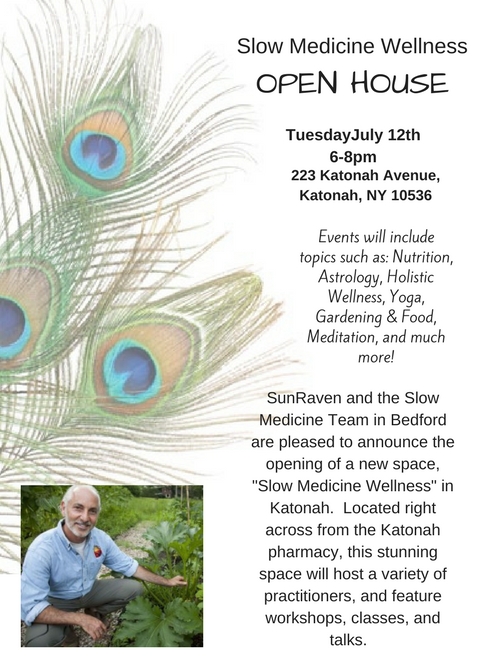 SunRaven and the Slow Medicine Team in Bedford are pleased to announce the opening of a new space, “Slow Medicine Wellness” in Katonah. Located right across from the Katonah pharmacy at 223 Katonah Avenue, this stunning space will host a variety of practitioners, and feature workshops, classes, and talks. Events will include topics such as: Nutrition, Astrology, Holistic Wellness, Yoga, Gardening & Food, Meditation, and much more. Stop by the Open House between 6-8pm on Tuesday, July 12th.
