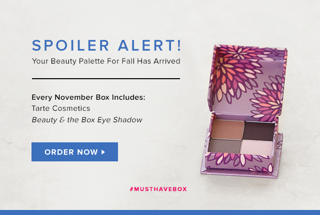 BeautySpoiler Alert! Here’s a Sneak Peak of the November Must Have Box! Posted on October 23, 2015October 23, 2015 by Stacy G 23 Oct Every November Must Have Box will include a Tarte Cosmetics Beauty & the Box Eye Shadow! This product is a $22 Value! Stacy G It's What I Know. Who I know .Where I want to go. Forever Twenty-None: 3 Investments for Your Grown-Up Wardrobe Fall Cocktails Crafted by Hudson Valley’s Top Mixologists