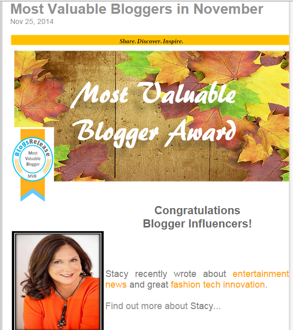 I am thrilled to have been awarded Most Valuable Blogger (MVB) by BlogsRelease .I love BlogsRelease. It is one of my secret weapons in keeping up on trends. They make sharing so easy. In reality I should give BlogsRelease an Award!!!!BlogsRelease makes sharing incredibly easy, by providing text, images, links and videos.As bloggers have become important players in the digital public media, Blog Release simplifies my blogging by providing images, videos, links, social media profiles, references, coupons. As a serious blogger, I appreciate the wealth and depth of information and the media.Not only do bloggers receive the latest press releases, brands also invite bloggers to exclusive review opportunities and event invitations.