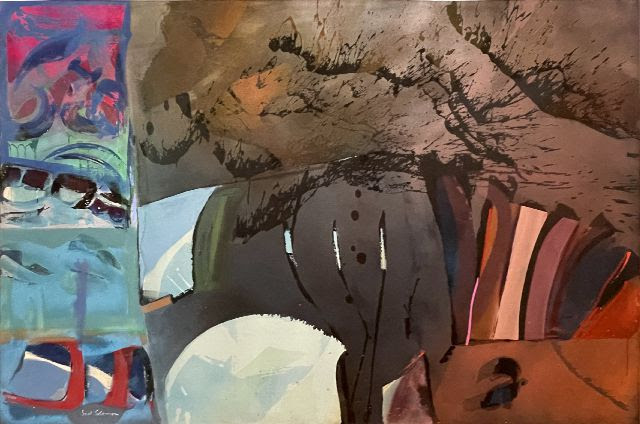 Because Solomon suffered frostbite during the Battle of the Bulge, he could not live in cold climates, so he and Annie chose to settle in Sarasota, Florida, after the War. Sarasota was home to the John and Mable Ringling Museum of Art, and soon Solomon became friends with Arthur Everett “Chick” Austin, Jr., the museum’s first Director. In the late 1940s, Solomon experimented with new synthetic media, the precursors to acrylic paints provided to him by chemist Guy Pascal, who was developing them. Victor D’Amico, the first Director of Education for the Museum of Modern Art, recognized Solomon as the first artist to use acrylic paint. His early experimentation with this medium as well as other media put him at the forefront of technical innovations in his generation. He was also one of the first artists to use aerosol sprays and combined them with resists, an innovation influenced by his camouflage experience.