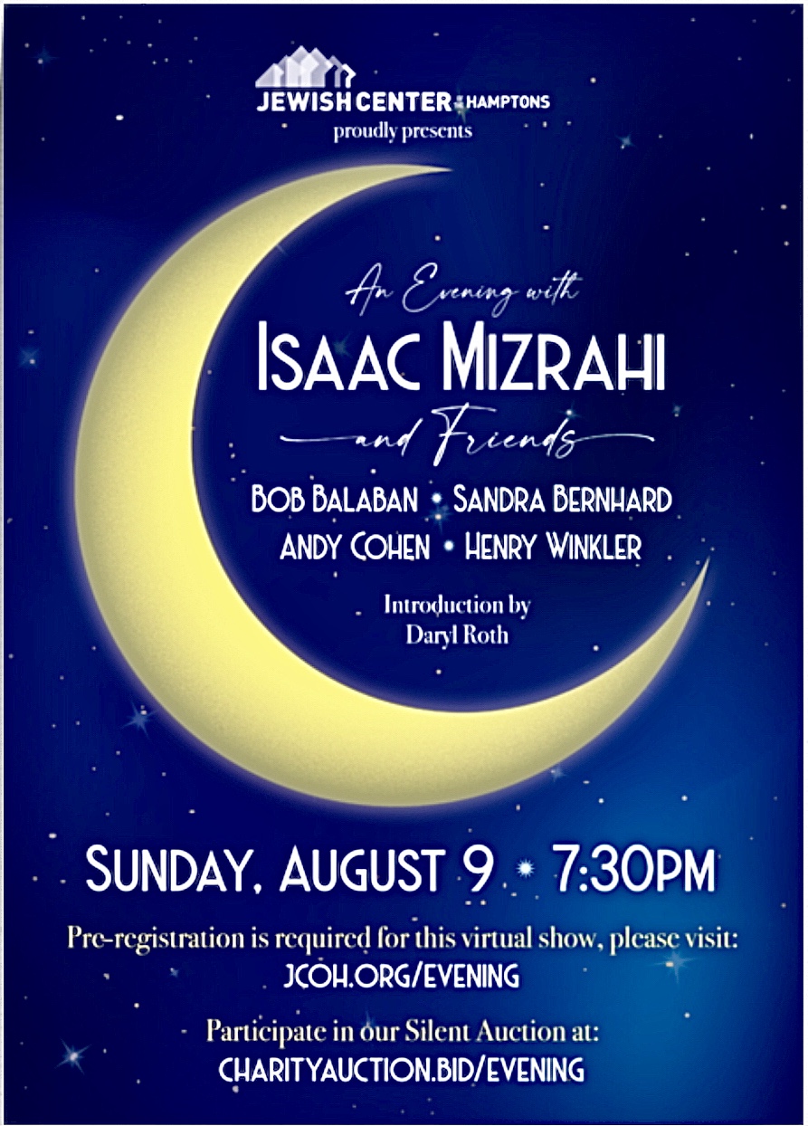 A night on the town may be hard to find these days, but the Jewish Center of the Hamptons can do one better. Join us for our fun-filled event, A Virtual Evening with Isaac Mizrahi and Friends. This unprecedented, exclusive show will engage and entertain audiences of all ages.