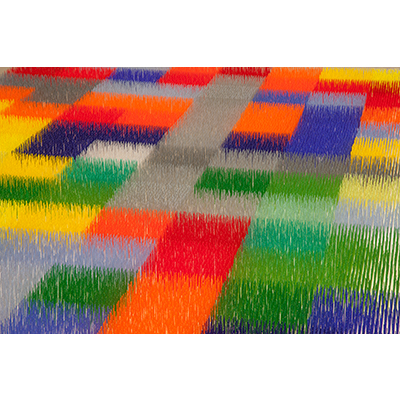 Walking alongside the periphery of this luminous field, the colors blend and blur slightly in a moiré effect. “It becomes a physical experience,” says Lou, whose first and smaller version of Color Field was displayed at the Museum of Contemporary Art San Diego in 2013. Lou also describes Color Field as a celebration of the hand made. “There is a kind of apotheosis of the human hand,” she says. “Color Field started with a very simple activity, that of threading glass beads onto pieces of stainless steel wire, but there is a tipping point where simplicity yields to something larger, not only in scale, but in depth and complexity, and for me, that’s where things start to get interesting.” The effect can be thrilling.