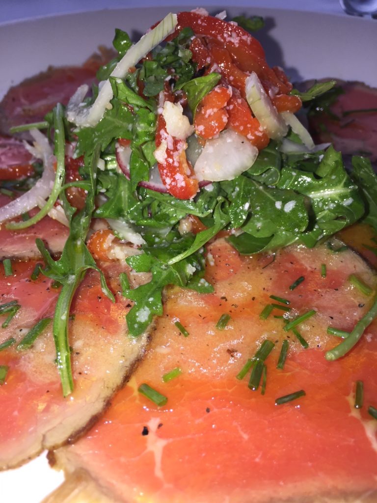 Beef Carpaccio – Peperonata, sweet mayo onion, radish, chive, baby arugula