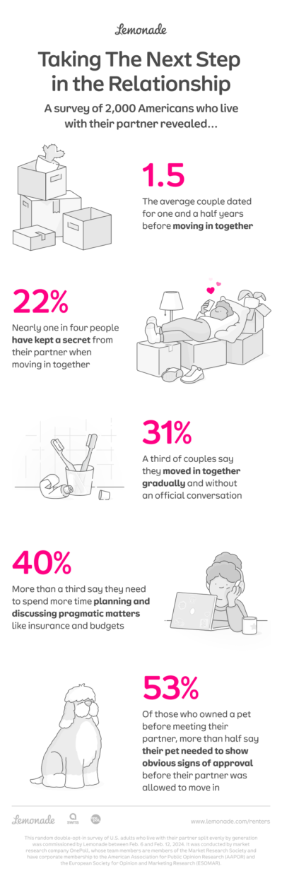 The survey, commissioned by Lemonade and conducted by OnePoll, looked at the most common conversations and timelines couples have when moving in together and found that most couples dated for an average of one and a half years before taking the big step.