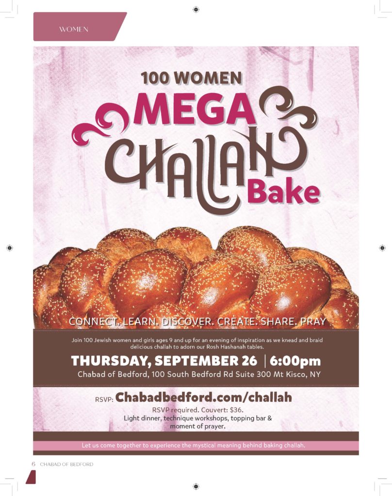 On Thursday, September 26, Chabad of Bedford will host a Challah baking workshop in honor of the holiday of Rosh Hashanah. Participants will mix and knead their own batch of dough, learn an array of braiding techniques and the traditional and mystical meaning behind every step that goes into making this fragrant bread.