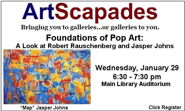 ArtScapades will be presenting Foundations of Pop Art: A Look at Robert Rauschenberg and Jasper Johns this Wednesday, January 29th at 6:30 pm at the Norwalk Library.