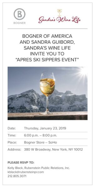 Sandra Guibord, Sandra’s Wine Life is hosting an “Après Ski Sippers” event with BOGNER of America at their SoHo [see more...]