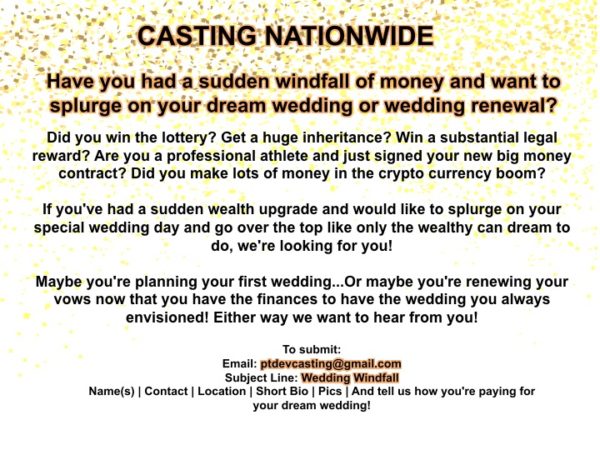 Casting Couples who have had a sudden windfall of money and want to splurge on their dream wedding or wedding renewa