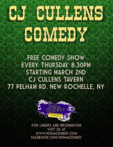 Every Thursday: Free Comedy show at CJ Cullens Tavern in New Rochelle at 8:30pm.