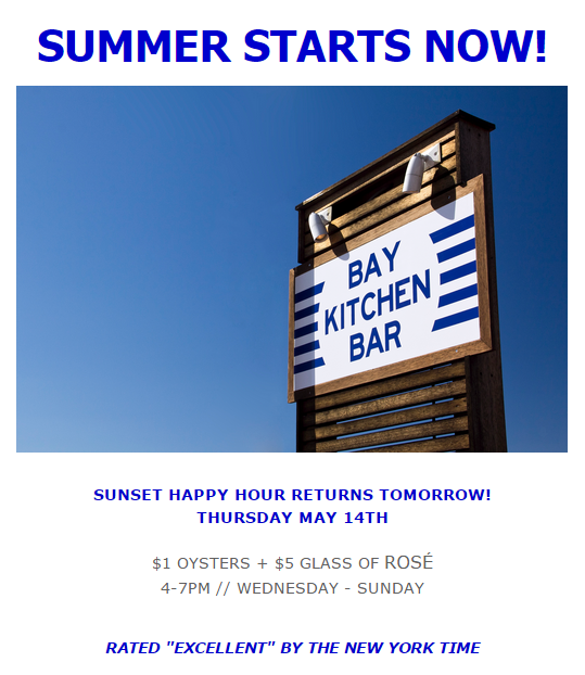Bay Kitchen Bar has re-opened for the season. Father- and-son co-owners Eric and Adam Miller and their team are serving dinner Thursday-Sunday, each night kicks off with $1 Oyster Happy Hour from 4-7pm in the bar and lounge, including $5 rosé by the glass and sunset views over Three Mile Harbor!