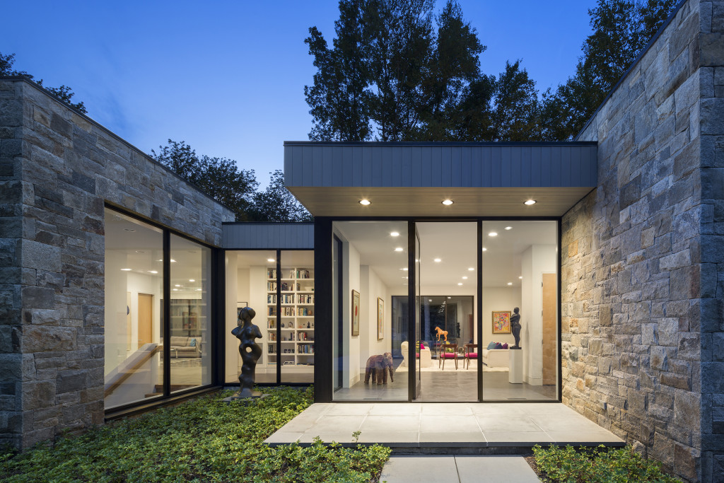 Art House 2.0 was designed as a serene, modern retreat to showcase the client’s growing modern art collection. The project is nestled amidst natural stone outcroppings and untouched forest and uses indigenous stone and cedar to juxtapose rectilinear forms and glass expanses. The use of shaded horizontal overhangs takes advantage of natural daylight to illuminate the interior and creates a passive solar effect. Ms. Kurth designed the client’s first home more than 25 years ago and collaborated with them again to design an open, airy, gallery-like backdrop that frames the gorgeous Westchester woodland views.