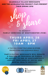 Scarsdale Village Spring Shop & Share event to benefit Family Services of Westchester (FSW) on Thursday and Friday, April 26th and April 27th.