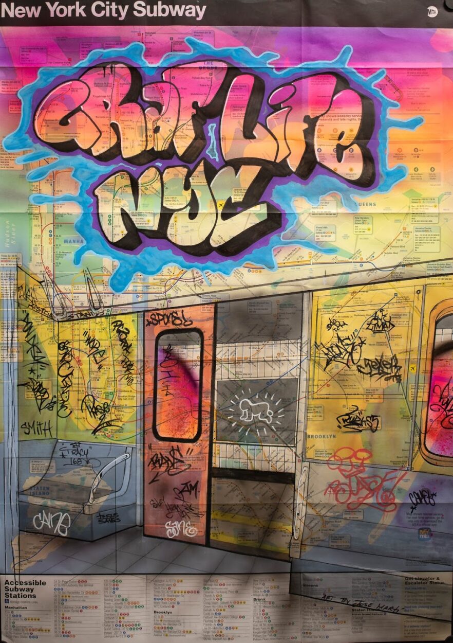 Born in Bushwick Brooklyn, Portchester resident and self-taught graffiti artist José Martí fell in love with art when he was 7 years old. “My father worked in the publishing business so I would study book illustrations for hours but it was when I first saw the work of legendary graffiti artists Lee Quinonez And Dondi White at the Hugh handball courts in Queens is the moment I fell in love with art,” Martí says, “I started tagging when I was 13 years old as a rite of passage really and sometimes even getting the nod from the police nearby” adding with a laugh “I guess they liked my work”. Martí’s work is mixed media using vintage (and newer) MTA subway maps as well as skate decks and empty spray cans as his canvas. “I love the feel of the vintage MTA maps and some of my works are based on memories of the old subway cars my friends used to paint on,” Martí explains. Currently, Martí juggles his time between painting and teaching martial arts at his Martí Marshall Arts Academy in Bedford Hills.