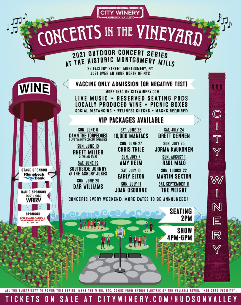 “Admittedly, social distancing circles and masks didn’t figure into my original dream of hosting outdoor shows on this expansive and beautiful lawn surrounded by vineyards, but these safety measures are part of our company’s hospitality practices, and we all embrace them. I am excited to have this opportunity to finally bring live music to the Hudson Valley and have fans fully experience our food and wine options,” Dorf continued. “We are also very proud to be generating our own electricity from the Hydro Electricity from the old mill on the Wallkill River, making our facility and this concert series a fully net zero user of energy. It feels good to emerge from this pandemic with eye on being environmentally conscious moving forward,” Dorf added.
