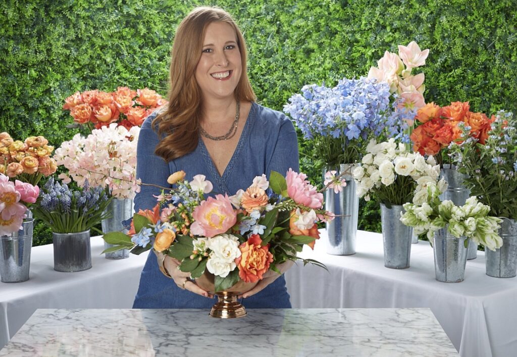 Zoom & Bloom is a virtual floral workshop, but with everything needed to make a lush arrangement which is delivered to the participant – the flowers, the container, the tools and the instruction (by Zoom) – “It’s like the Hello Fresh of flowers,” says Merritt, a New York City floral designer whose work has been featured on TLC Network and in venues like the Rainbow Room. Together, they craft remarkable bouquets that liven-up family holiday tables and their homes.
