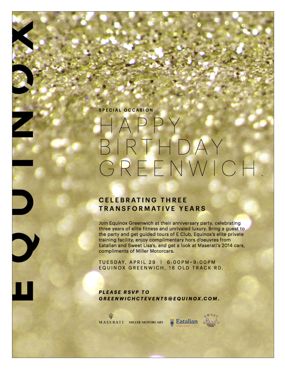 If you are looking for a new gym or even just a night out, join Equinox Greenwich in the celebration of three years of elite fitness and unrivaled luxury with complimentary refreshments, exclusive offers and special events.