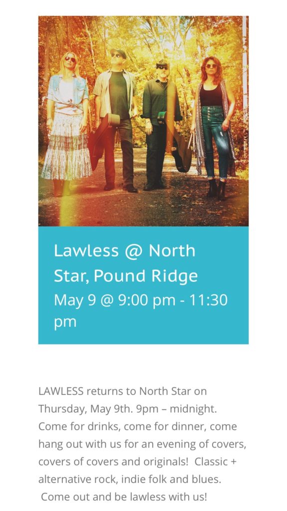 WestchesterLAWLESS warms up Pound Ridge Posted on May 7, 2019May 7, 2019 by Stacy G 07 May Stacy G It's What I Know. Who I know .Where I want to go. Farm Market and New Market Manager at John Jay Homestead Paul Anka: Anka Sings Sinatra Show Includes Pre-Show Cocktail Party at The Ridgefield Playhouse on May 15