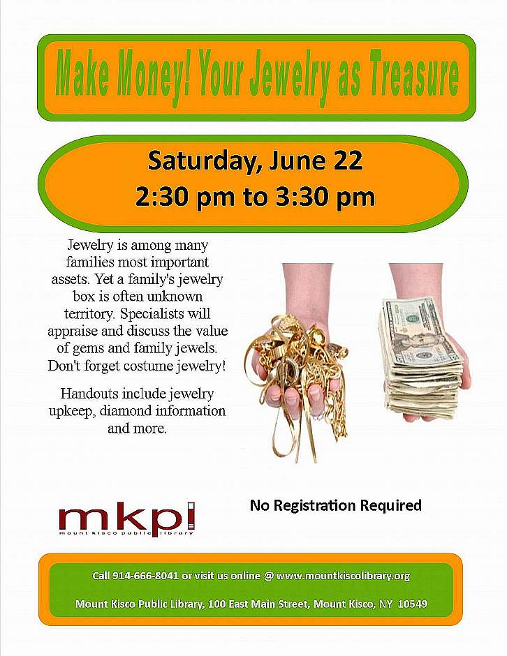 A real-life treasure hunt is taking place at this town’s library on Saturday, June 22nd, from 2:30 to 3:30 pm, as Mount Kisco Public Library (MKPL) enrolls local experts in a talk titled “Make Money – Your Jewelry as Treasure.”