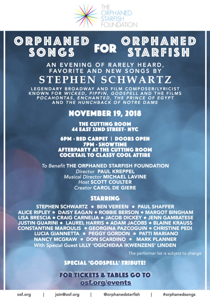 Please join us on NOVEMBER 19th to celebrate the music of legendary Broadway and film composer/lyricist Stephen Schwartz, known for Wicked, Pippin, Godspell and the films Pocahontas, Enchanted, the Prince of Egypt and The Hunchback of Notre Dame! To benefit the over 13,000 children of The Orphaned Starfish Foundation. It will be a very special night! For tickets go to osf.org/events