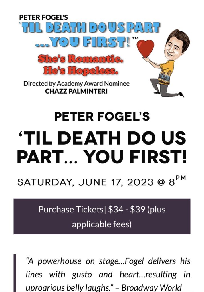 THE HYSTERICAL OFF-BROADWAY HIT COMEDY HAS ARRIVED Peter Fogel’s (TIL DEATH DO US PART ∞ YOU FIRSTO Written & Performed by Peter Fogel She’s Romantic. He’s Hopeless • Directed by Academy Award Nominee CHAZZ PALMINTERI “Uproarious Belly Laughs! A Powerhouse On Stage, Fogel Captivates His Audience with Wacky Character Voices and Bold Gestures!” ~BroadwayWorld.Com “A Very Funny Show About Marriage & Relationships! Go See it!’ ~Ray Romano (Everybody Loves Raymond) SPECIAL ÉVENT SAT. JUNE 17 – 8 PM Emelin Theater ] 153 Library Ln. Mamaroneck, NY 10543 For tix, visit: https://emelin.org/event/peter