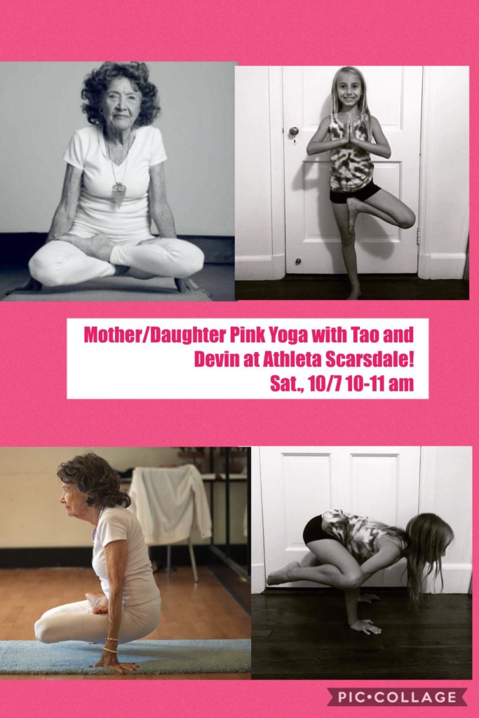 Kick off Breast Cancer Awareness month with a Mother/Daughter Pink Yoga class with Tao Porchon-Lynch @taoporchonlynch and Devin at Athleta Scarsdale on Sat., 10/7 10-11 am! Call (914)723-0961 to sign up. Bring a daughter, friend, sister! Wear Pink! bring a mat! #pinkyoga #athletascarsdale #motherdaughter #breastcancerawareness #powerofshe #
