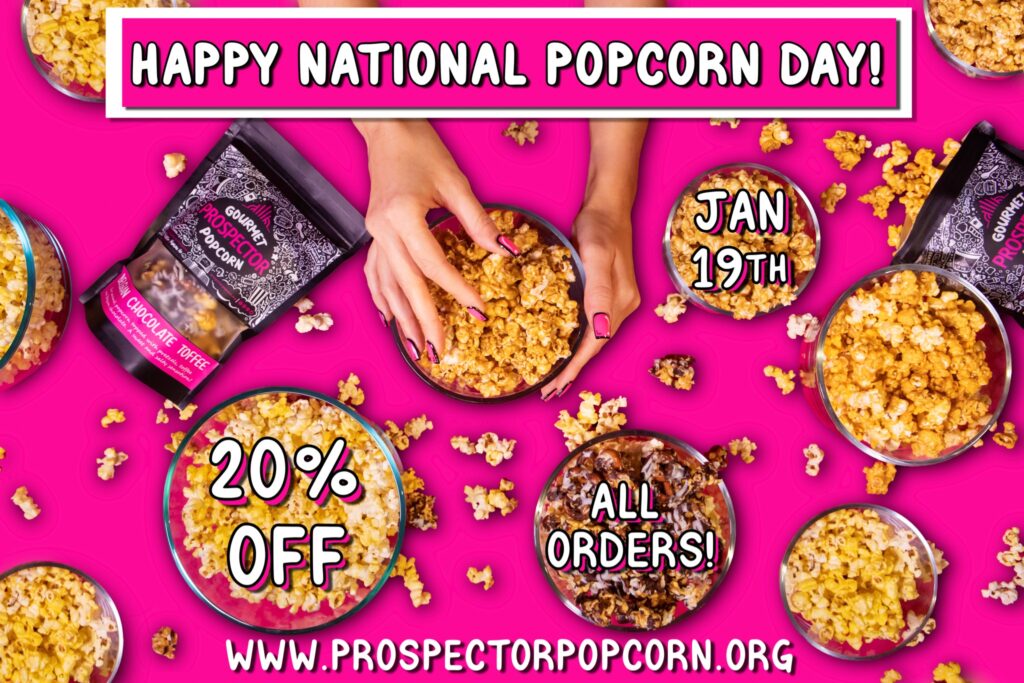 Prospector Popcorn will be holding a site-wide 20% off sale on National Popcorn Day, January 19th, 2023 to give everyone their fix for popcorn, perfect for a tv show or movie binge to celebrate the spirit of popcorn, the Prospector, and their mission.
