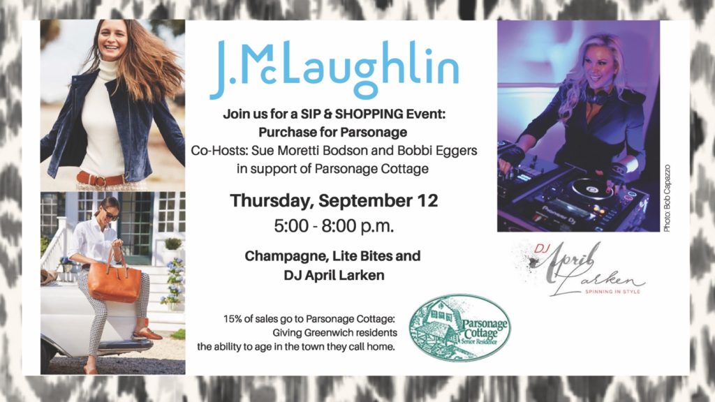 Join Co-hosts Sue Moretti Bodson and Bobbi Eggers with DJ April Larken to shop for a cause in support of Parsonage Cottage Senior Residence at classic American clothier J. McLaughlin at its Greenwich location at 55 East Putnam Avenue. The fundraising event will culminate on Thursday, September 12 from 5:00pm to 8:00pm at the boutique. Join us for a fun evening of light bites,