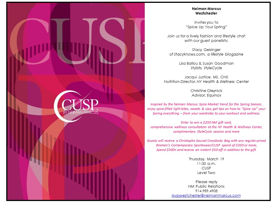 Shopping, WestchesterSpice it up for Spring With Stacyknows March 19th Posted on March 11, 2015June 19, 2018 by Stacy G 11 Mar Join Me There will be Sips and Tips from Neiman Marcus to Spice up Your Spring. Fashion advice from the stylists from StyleCycle. Bikini Basics from nutritionists Jacqui Justice. Exercise tips and Chair Massages provide by Equinox. Chances to win!!! And a Goody Bag!!!! Stacy G It's What I Know. Who I know .Where I want to go. Couple Shares Ordeal of Protecting Elderly Parent from Financial Predator @OFF5thWPLAINS @SaksOFF5TH