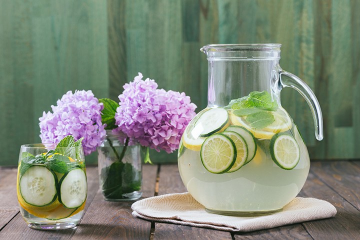 To begin your tummy tox plan, fill a 48-ounce pitcher with water and add ginger, mint leaves, cucumber, and lemon. While on the surface this may seem like any other flavored beverage, these ingredients are key in restoring your health and wellness. Lemon helps clean out the digestive system, thanks to the enzyme-stimulating acids. Cucumbers prevent water retention and have anti-inflammatory properties. Mint promotes easy digestion and soothes stomach cramps. Ginger is also anti-inflammatory and provides soothing relief for the digestive tract, which can relieve gassiness and bloat. Try to finish the pitcher by end of day, and feel free to drink it on its own or with your meals.