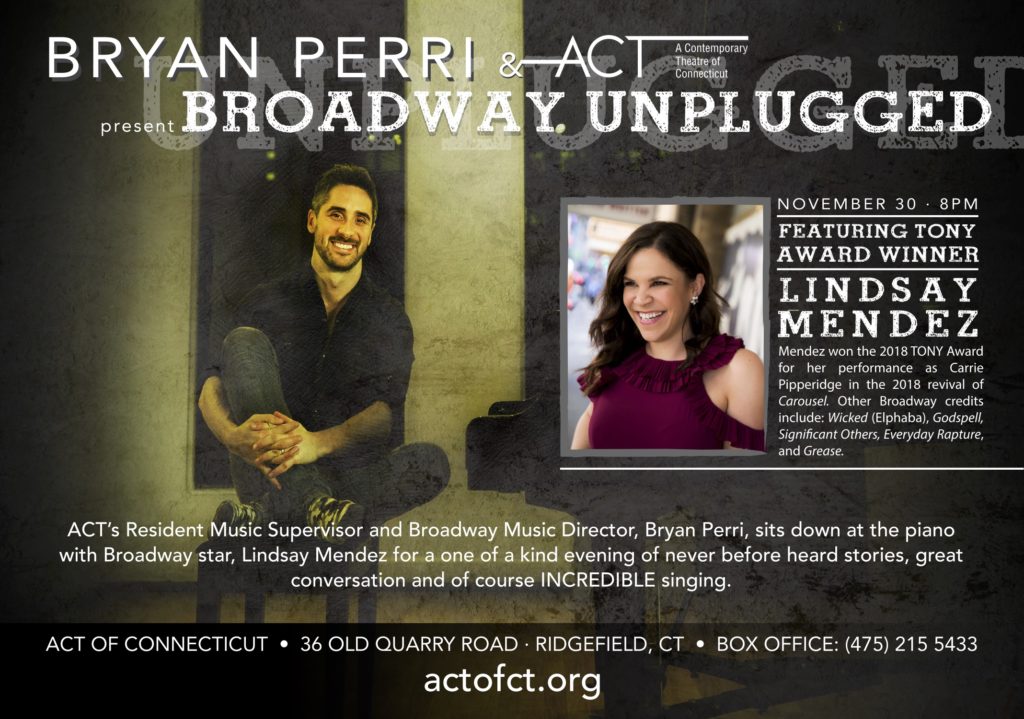 ACT (A Contemporary Theater) of Connecticut is thrilled to announce that 2018 TONY Award® winner Lindsay Mendez, recent star of the Broadway revival of Carousel, will join ACT’s Resident Music Supervisor, Bryan Perri, on November 30, 2018 in the next performance of the Broadway Unplugged Series!
