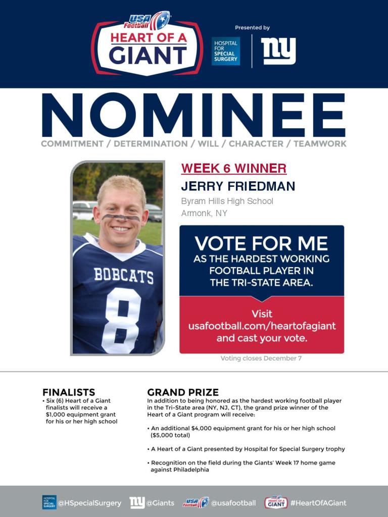 Please take a moment to vote for my friend’s son, Jerry Friedman, Byram Hills senior football player, in Heart Of A Giant contest.