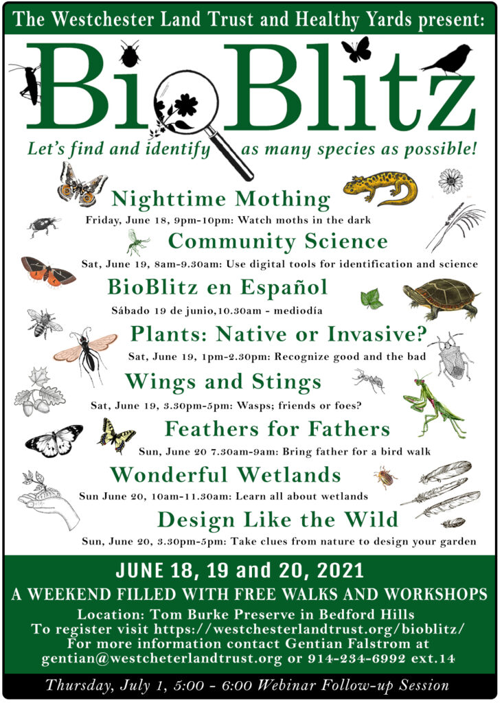 With the help of the public, Westchester Land Trust (WLT) and Healthy Yards are collaborating on an effort to find and identify as many species of plants and wildlife as possible through a series of events June 18-20. Nine programs will be featured in the BioBlitz to be held at Westchester Land Trust’s Tom Burke Preserve in Bedford Hills.