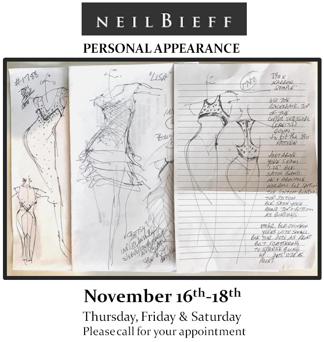 NEIL BIEFF, Will be doing a personal appearance and trunk show at Mary Jane Denzer thisThursday Friday and Saturday.